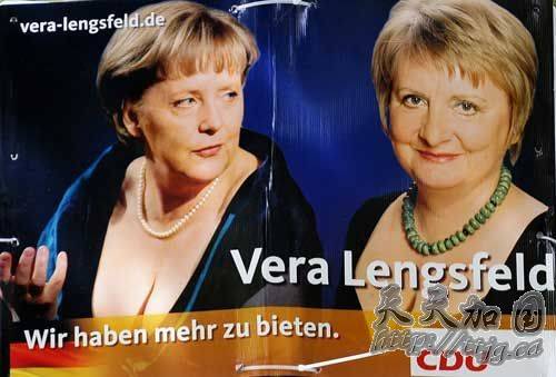 据新加坡《联合早报》报道,德国基督教民主联盟成员伦斯费尔德将在下个月27日的选举中,竞选柏林一个左翼选区的议席。她的竞选团队最近张贴的竞选海报,展示了她本人和默克尔并列在一起的照片。两人都穿上低胸晚装,露出了性感乳沟,上头还打上“ 我们还有更多可以奉献”的标语。