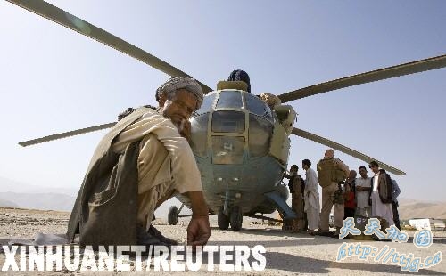 8月14日,在阿富汗东北部巴达赫尚省首府法扎巴德,一名阿富汗人蹲在运送选举物资的直升机前。这些选举物资将被运往一些村镇,为定于8月20日举行的阿富汗总统选举做准备。 新华社/路透