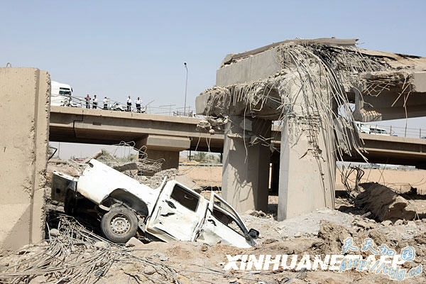 这是2009年8月19日在伊拉克首都巴格达财政部附近拍摄的被炸毁的大桥。伊拉克内政部19日发布的最新消息说,巴格达市中心当天发生的两起爆炸袭击事件已造成95人死亡、563人受伤。