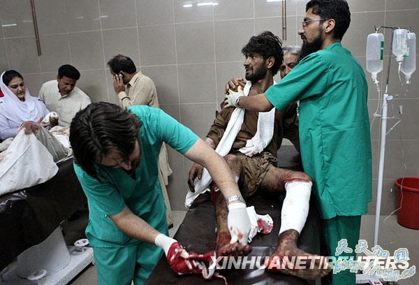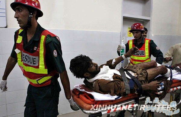 8月20日,在巴基斯坦拉瓦尔品第市,救援人员将一名被炸伤的男子运送到医院。当日,拉瓦尔品第市的一个安全检查站发生一起炸弹爆炸事件,造成至少6人受伤。新华社/路透 8月20日,在巴基斯坦拉瓦尔品第市,医护人员正在救助一名被炸伤的男子。当日,拉瓦尔品第市的一个安全检查站发生一起炸弹爆炸事件,造成至少6人受伤。