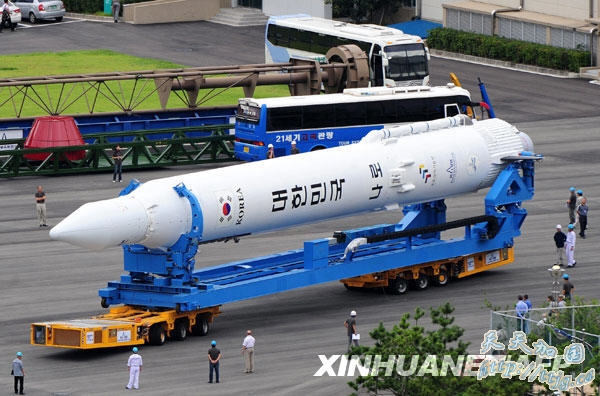 8月23日,在韩国罗老宇航中心,“罗老”号火箭被运往发射架。韩国将于本月25日再次在罗老宇航中心发射19日因软件故障中止发射的韩国首枚运载火箭“罗老”号。由于与俄方签署协议出现滞后等原因,“罗老”号的发射时间从2007年一推再推。新华社/法新