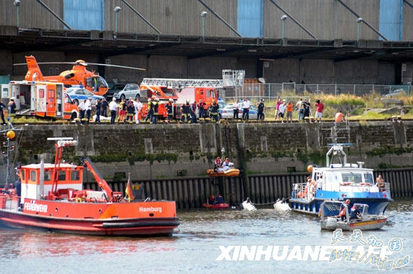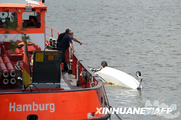 8月22日,救援人员在德国北部的汉堡港查看一架坠入水中的小型飞机。警方称,事故造成机上一名旅客受重伤,另有一名妇女在送往医院后死亡。