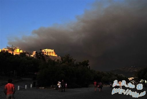 8月22日傍晚,肆虐的森林大火烧到了雅典卫城东北方向的山上,火灾造成的大片烟雾笼罩在卫城上方。