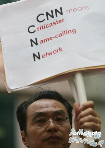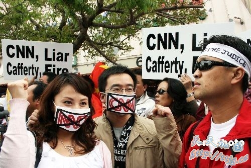 2008年四月二十三日,香港教育团体───教育评议会在CNN驻香港办事处外集会,抗议CNN电视主播辱华言论,要求CNN正式收回有关言论,并由最高负责人向全世界的中国人道歉。 中新社发 武仲林 摄