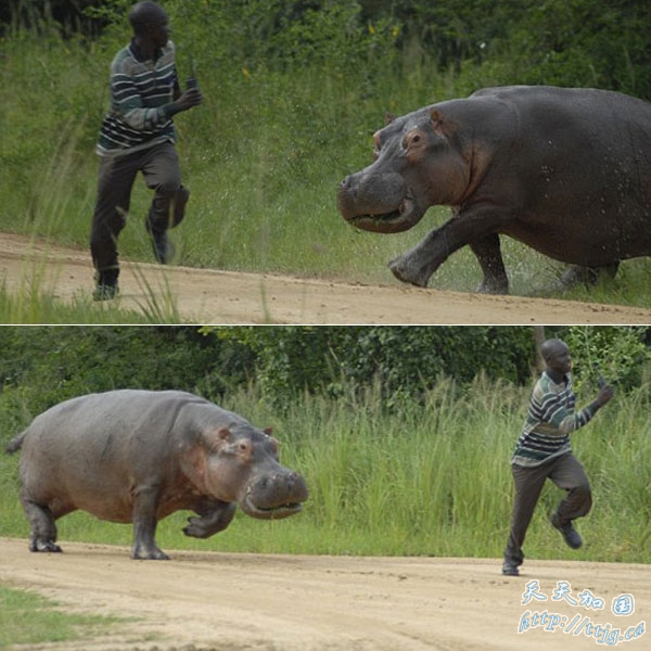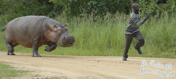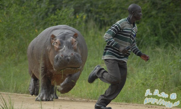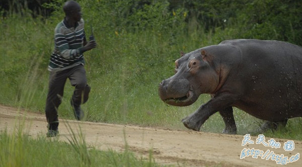 据英国媒体23日报道,乌干达猎场一只大河马在吃午餐时遭到一名看守人打扰,河马怒了,突然冲了出来,看守人被吓得落荒而逃。
