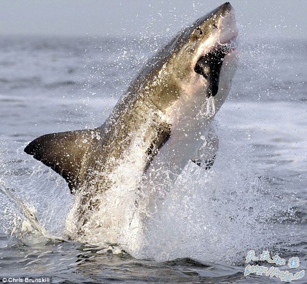 在摄影师Chris Brunskill的镜头中,大白鲨虽然体形硕大,捕食时却身手矫健,纵身跃出水面6米高,张开大嘴将它的“美食”紧紧咬在口中。