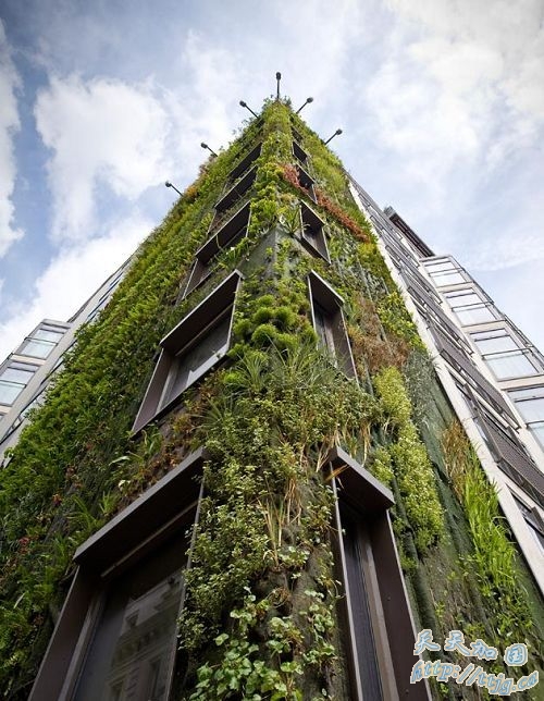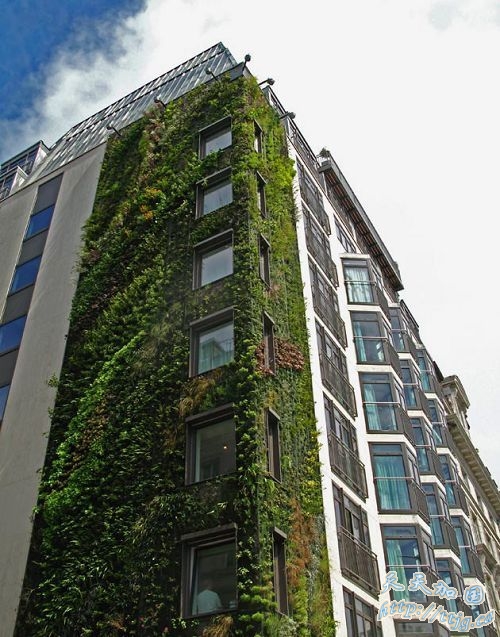帕特里克·布兰克(Patrick Blanc)是一位著名的法国植物学家,由他设计的诸多空中垂直花园系列作品得到了广泛好评,其中就包括葡萄牙一家购物中心里的一座垂直花园。这个花园面积比四个网球场的总面积还要大。另外还有为科威特所设计的一个垂直花园,也受到极大关注。但是,近期这位植物学家的作品却是历来规格最高的,他用绿色植物覆盖了8层楼高的英国伦敦雅典娜酒店,使其成为了一座壮观的空中花园。这座绿色公园由1.2万棵绿色植物组成,宛如一座脱离了引力限制的空中森林。