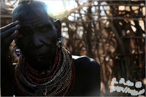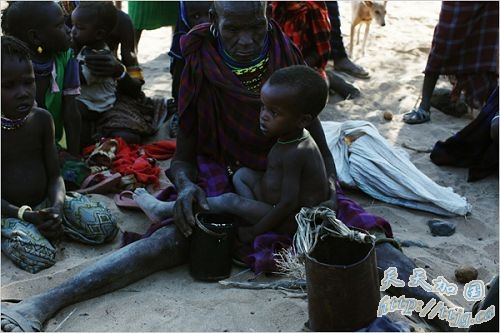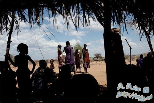 图:家族成员正在等待分发食品。图尔卡纳人还保留着他们的传统。妇女们戴着一串串的珠子,头发剔得很短。男人们也戴着多串彩色的项链。他们分散住在高原上,以放牧为生。