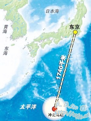 冲鸟礁位于日本以南1000多公里,退潮时东西长4.5公里、南北长1.7公里、周长11公里。涨潮时,冲鸟礁基本淹没在海水中,只有两块礁石露出水面,面积不到10平方米。