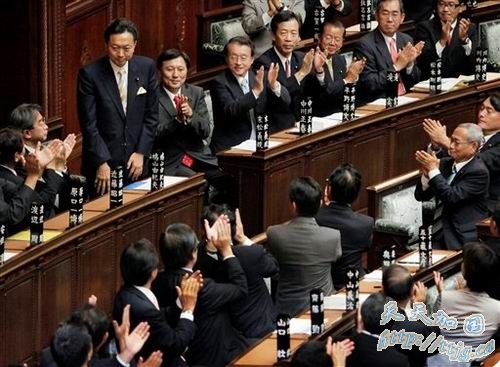 9月16日,在日本首都东京,日本民主党党首鸠山由纪夫在当选首相后起立接受议员的祝贺。