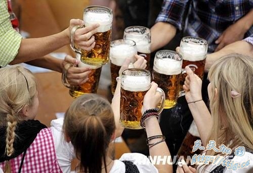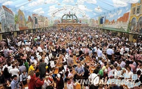 9月19日,在德国南部城市慕尼黑,人们在慕尼黑啤酒节上享受啤酒盛宴。