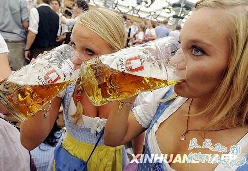 9月19日,在德国南部城市慕尼黑,身着传统连衣裙的女孩在慕尼黑啤酒节上畅饮啤酒。