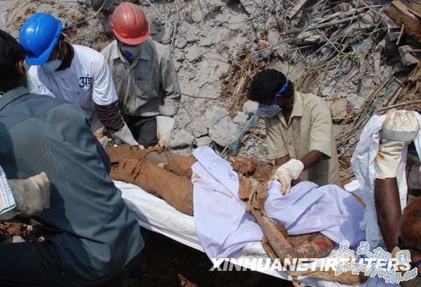 9月24日,在印度中部切蒂斯格尔邦的科尔巴,救援人员将一具遇难者遗体从倒塌的烟囱废墟中抬出。