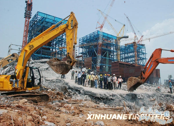 9月24日,在印度中部切蒂斯格尔邦的科尔巴,救援人员站在烟囱倒塌事故现场。新华社/路透