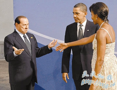 据香港《文汇报》报道,晚宴上,奥巴马夫妇以东道主身份负责迎宾,被意大利媒体称为“性上瘾”的老贝见到美国第一夫人米歇尔时显得相当高兴,伸出双臂示意互相拥抱。谁知米歇尔远远伸出一只手,示意握手打招呼,令场面显得很尴尬。更值得注意的是,站在一旁的奥巴马一脸冷漠,斜睨老贝,显得十分警惕。