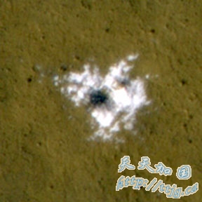 图:火星上最近碰撞形成的一个陨石坑,显示明亮的冰块被从地下撞击了出来。
