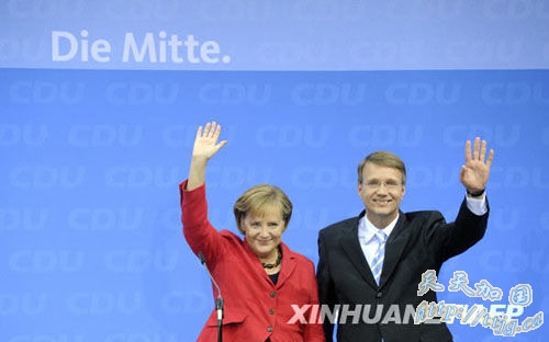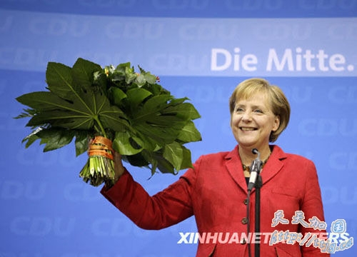 新华网柏林9月27日报道 德国现任总理默克尔27日晚宣布成功竞选连任。根据德国电视台公布的选举预测结果,默克尔领导的由基民盟和基社盟组成的联盟党和德国自民党已赢得了德国议院的多数议席,为双方组成中右联合政府铺平了道路。