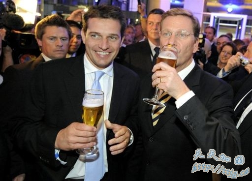 当地时间27日晚,自由民主党领导人Guido Westerwelle(右)和他的搭档在喝啤酒庆祝竞选结果。随着默克尔赢得大选,基民盟将和自由民主党组成的联合政府。