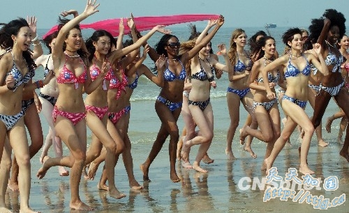 10月2日晚,第四届北海国际海滩旅游文化节暨2009新丝路世界比基尼小姐大赛在广西北海银滩举行开幕式晚会,来自美国、英国、瑞典、挪威、澳大利亚30多个国家和地区的46位比基尼佳丽相聚北海,倾情演绎“南珠之乡”这座优美生态休闲人居新城的动感之美。
