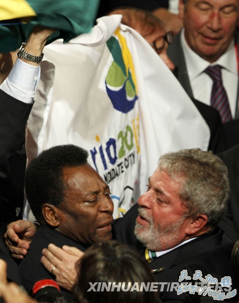 在丹麦首都哥本哈根,巴西总统卢拉(下右)和“球王”贝利(下左)在里约热内卢申奥成功后相拥庆祝。