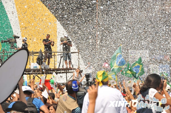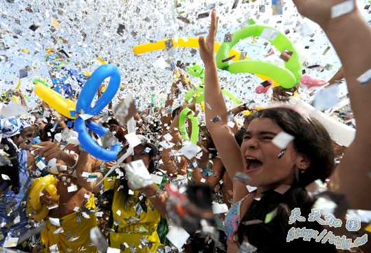 巴西里约热内卢市民在科帕卡巴纳海滩上庆祝里约申奥成功