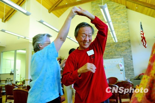 图为高锟在当地的老年中心和护理人员跳舞,安享晚年。中新社发 陈钢 摄