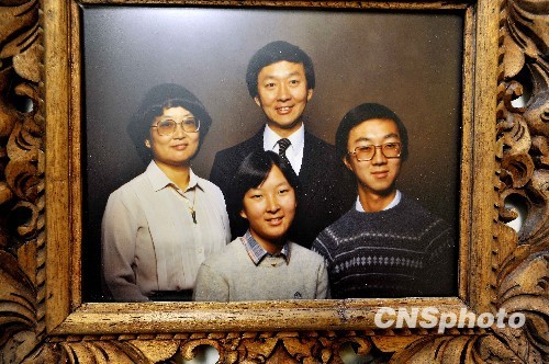 “光纤之父”高锟和夫人在美国硅谷的寓所内的全家福照片。中新社发 陈钢 摄