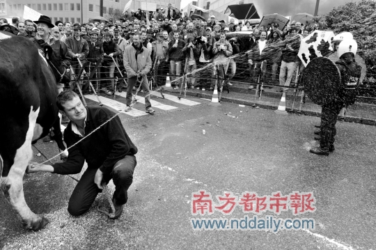 奶农们情绪激动,朝警察扔瓶子、鸡蛋、栗子并撒干草,把一头奶牛赶至总部附近广场,在那里燃放鞭炮、焚烧轮胎和干草。奶牛一时受惊,到处乱跑。