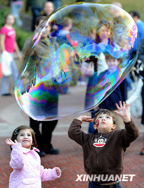 10月11日,两个孩子在美国纽约中央公园内追逐泡泡。当日,一名艺人用自制的工具造出多彩的泡泡供游人观赏,让秋日的中央公园充满了童真的情趣。新华社记者申宏摄