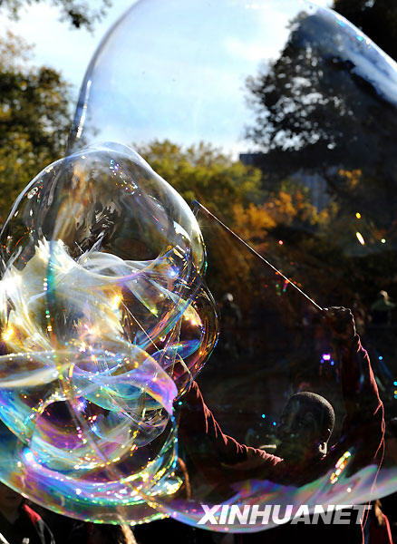 10月11日,在美国纽约中央公园,一名艺人用自制的工具造出多彩的泡泡供游人观赏,让秋日的中央公园充满了童真的情趣。新华社记者申宏摄