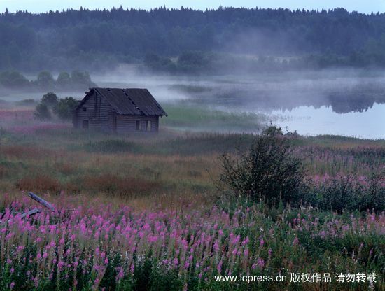 俄罗斯Archangelsk地区郊外,一座废弃的小木屋被清晨湖边的雾气所笼罩,显得亦真亦幻,分外美丽。