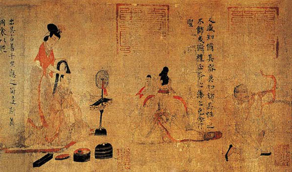 图为:《女史箴图》局部。某些藏品,如东晋顾恺之《女史箴图》的唐代摹本只有特别的专家才可获得机会一饱眼福。《女史箴图》是当今存世最早的中国绢画,是尚能见到的中国最早专业画家的作品之一,在中国美术史上具有里程碑的意义,一直是历代宫廷收藏的珍品。