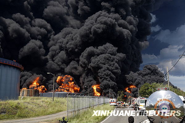 10月23日,在波多黎各卡塔尼奥,发生爆炸的炼油厂和油库被浓烟笼罩。