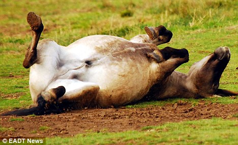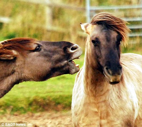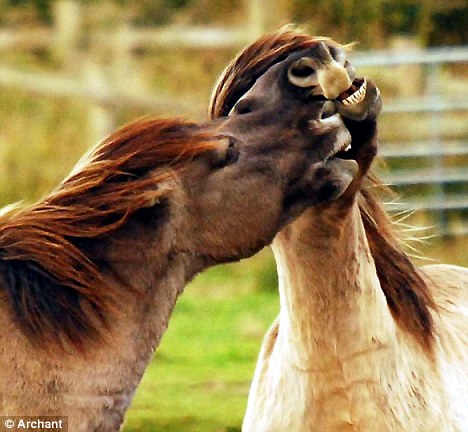 科学研究已经证实,不仅人类有语言,动物之间也有特定的“语言”相互沟通。可是人们惊异地发现,原来就连讲笑话也不是人类特有的,马也会讲笑话。英国野生动植物爱好者马克·里夫在英国萨福克郡一个自然保护区内拍摄到一组图片,生动地记录了两匹科尼克斯野马“讲笑话”的情景,它们均露齿大笑,其中一匹马甚至笑翻在地。
