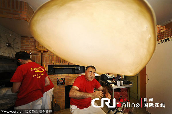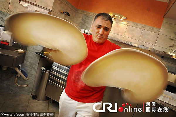 2009年10月22日,法国,世界比萨锦标赛冠军Paolino Bucca在表演杂技比萨。 2009年10月22日,法国,世界比萨锦标赛冠军Paolino Bucca在表演杂技比萨。