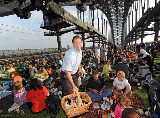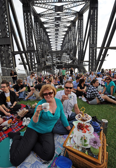 澳大利亚六千名群众25日早上齐集举世闻的悉尼港大桥,坐在绿油油的草地上享受早餐。