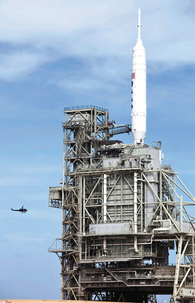 美国佛州肯尼迪航天中心,“战神I-X”运载火箭坐落在发射架上,准备就绪。[资料图片]