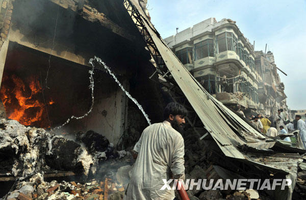 10月28日,一名巴基斯坦男子在西北边境省首府白沙瓦的爆炸现场灭火。白沙瓦一座市场当天发生爆炸,已造成至少80人死亡、200人受伤。新华社/法新
