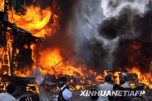 10月28日,巴基斯坦西北边境省首府白沙瓦的爆炸现场浓烟滚滚。白沙瓦一座市场当天发生爆炸,已造成至少80人死亡、200人受伤。 |