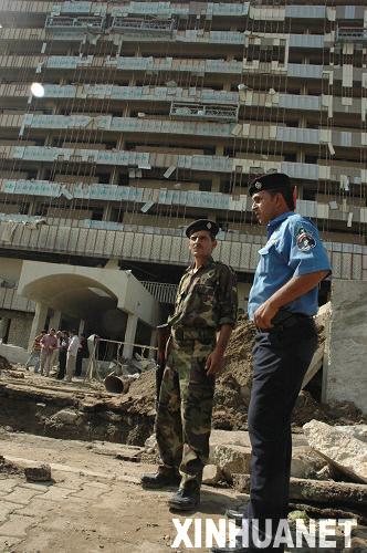 10月27日,在伊拉克首都巴格达,伊安全部队士兵守卫在遭到爆炸袭击的巴格达省政府大楼前。自10月25日巴格达发生连环爆炸后,伊拉克安全部队全面加强了巴格达警戒,在一些重要地区增加了检查站和巡逻人员数量。 新华社记者高山摄