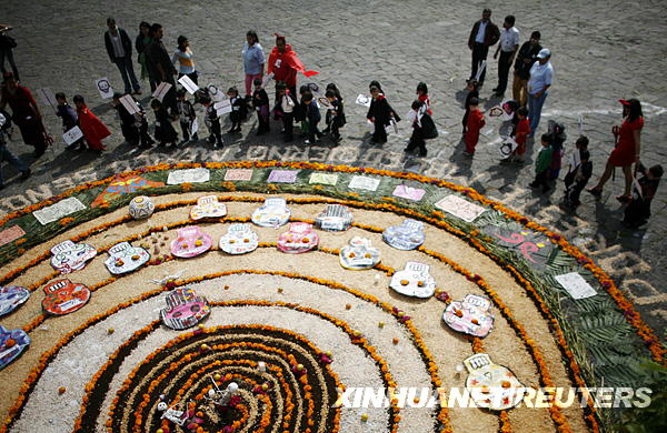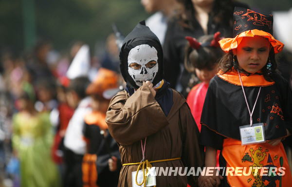 10月30日,在墨西哥首都墨西哥城,打扮成鬼怪模样的儿童参观一处为亡灵节而搭建的祭坛。新华社/路透