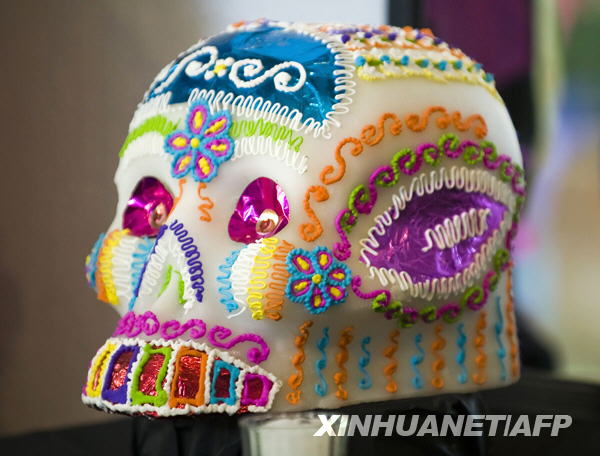 10月30日,在墨西哥首都墨西哥城,五颜六色的小骷髅头装饰物安放在为亡灵节而搭建的祭坛。新华社/法新
