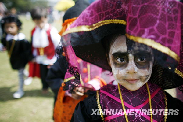 10月30日,在墨西哥首都墨西哥城,一名儿童打扮成鬼怪的模样参观一处为亡灵节而搭建的祭坛。11月1日开始的亡灵节是墨西哥一年中最热闹的传统节日之一。新华社/路透