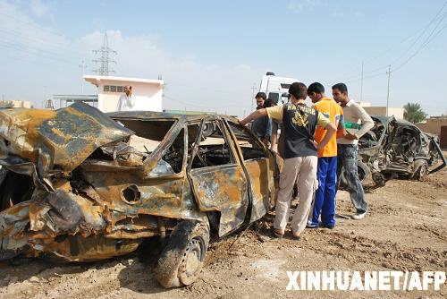资料图片:11月1日,在伊拉克西部城市拉马迪,几名男子查看汽车残骸。当天,拉马迪发生两起炸弹袭击事件,造成两人死亡。 新华社/法新