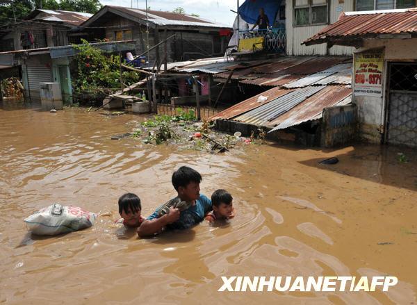 10月31日,在菲律宾内湖省的圣克鲁斯镇,一名男子带着孩子在被洪水淹没的街道上行走。新华社/法新