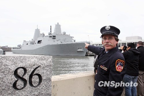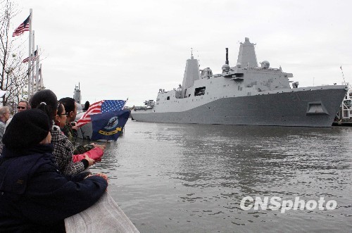 这艘军舰上,使用了七点五吨在“九·一一”事件中倒塌的世贸中心“双子塔”大楼废墟钢材,也因此以“纽约”命名。对于八年前遭受重创的纽约人来说,恐怖袭击的阴影和伤痛远未散去,这艘军舰也因此意义非凡。