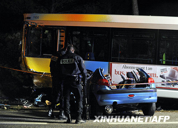 11月8日,在法国南部城市马赛,救援人员在车祸现场工作。当日,一辆小轿车和一辆巴士在马赛市相撞,造成2人死亡、另有1人受重伤。新华社/法新