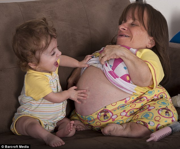 赫拉尔德向人们展示她高高隆起的腹部。赫拉尔德来自美国肯塔基州,患有脆骨病。这是一种骨骼发育不良的遗传性疾病。出生后,患儿极易发生骨折。患者通常下肢短小,类似侏儒。