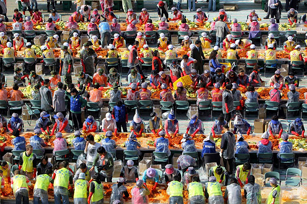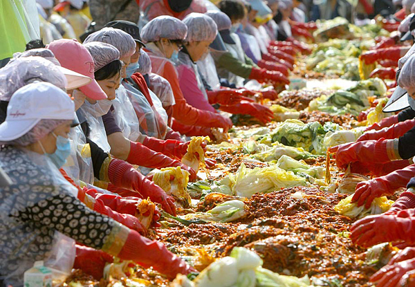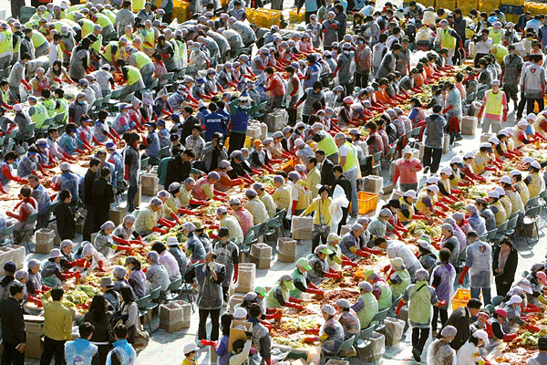 11月9日,约2700名韩国志愿者在首尔一所学校的操场上制作泡菜。