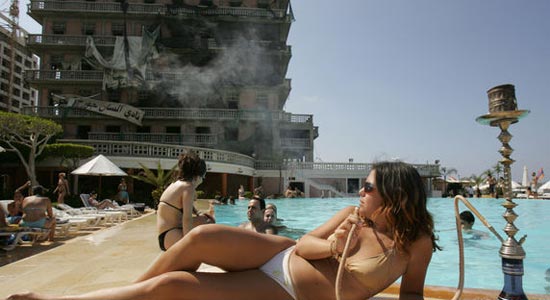 在圣乔治酒店享受阿拉伯水烟的女人。抽阿拉伯水烟是黎巴嫩人的传统,他们在看足球、聊天, 甚至是喝咖啡时, 都会点一壶水烟。这种水烟并不含尼古丁,壶里放的是柠檬和冰水,而上边燃烧的则是薄荷叶和香料,不仅不会上瘾, 还可以让人在阵阵幽香中放松情绪。